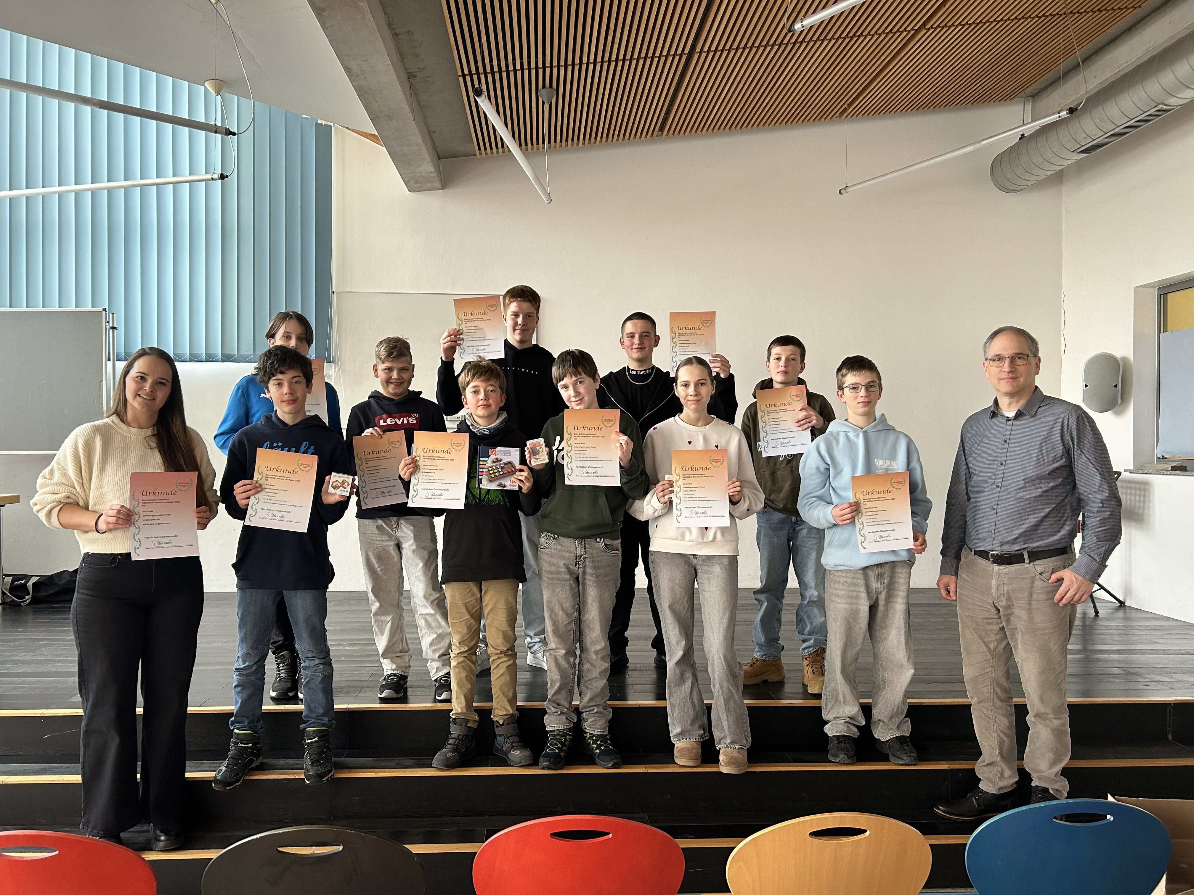 Die feierliche Übergabe der Urkunden erfolgte gemeinsam mit Schulleiter Herrn Cimiotti und der organisierenden Lehrerin Hanna Kunkel. Wir gratulieren den Gewinnerinnen und Gewinnern herzlich und bedanken uns bei allen Beteiligten für die erfolgreiche Durchführung des Wettbewerbs!