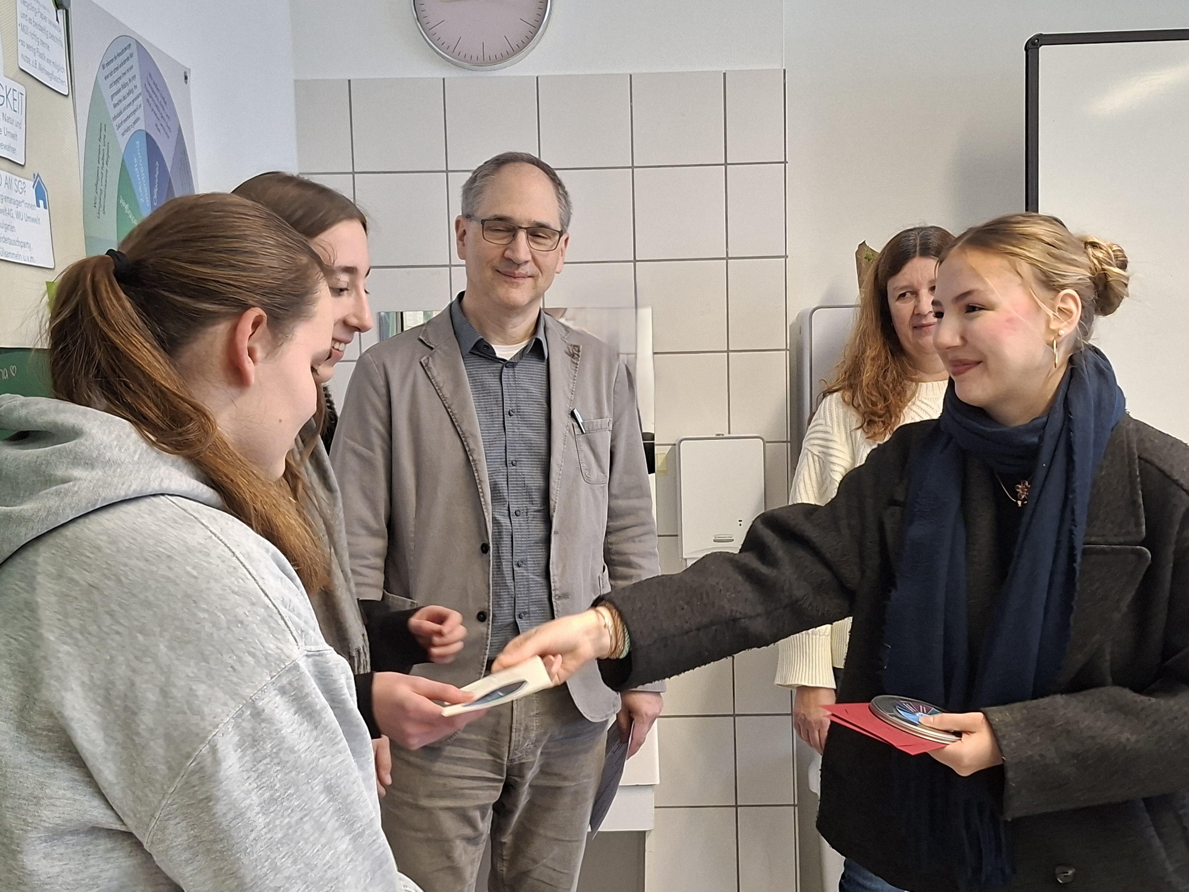 Über ihren Erfolg beim Mathematik-Wettbewerb des Landes Hessen freuen sich Dorothea Reiß, Maxim Slonov und Michael Schneider. Ihre beiden Mathematiklehrer Andreas Göbel und Michael Soub sowie Schulleiter Mario Cimiotti haben Dorothea und Maxim bei der Siegerehrung die Urkunden als zweite Schulsieger sowie Michael Schneider die Urkunde als ersten Schulsieger überreicht. Michael wurde zudem der Wanderpokal verliehen, der im Jahr 2008 vom ehemaligen stellvertretenden Schulleiter Holger Meyer gestiftet wurde und seitdem jährlich an die neue erste Schulsiegerin oder den neuen ersten Schulsieger weitergegeben wird. Alle drei Schulsieger haben mit Punktzahlen von 41.5, 41.5 und 44.0 Punkten hervorragende Ergebnisse erzielt und sich für die Teilnahme an der zweiten Wettbewerbsrunde (Kreisentscheid) am 4. März qualifiziert, auf die sie sich nun vorbereiten werden.
