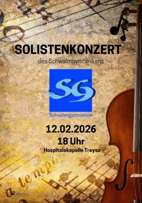 Am Donnerstag, dem 12. Februar 2026, lädt das Schwalmgymnasium um 18 Uhr herzlich zum diesjährigen Solistenkonzert ein. In der Hospitalkapelle Treysa präsentieren Schülerinnen und Schüler ihr musikalisches Können in solistischen Beiträgen. Das Publikum darf sich auf ein abwechslungsreiches Programm freuen, das unterschiedliche Epochen, Stilrichtungen und Instrumente umfasst. Alle Interessierten, Eltern, Freundinnen und Freunde der Schule sind herzlich eingeladen, diesen besonderen musikalischen Abend mitzuerleben. Der Eintritt ist frei.
