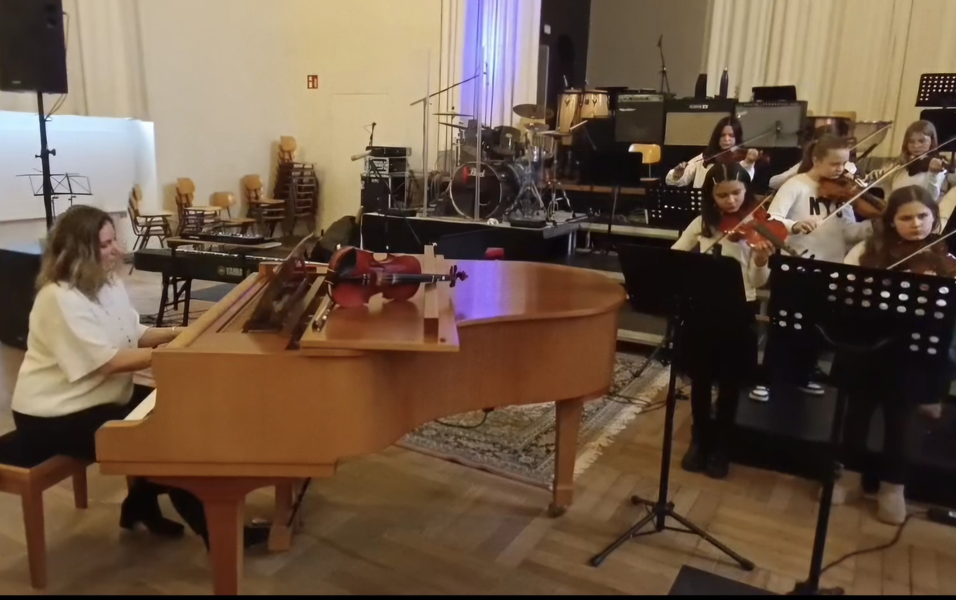 Beim Konzert präsentierten sie ein abwechslungsreiches Programm von klassischen Liedern wie Beethovens berühmter „Ode an die Freude“ über die deutschen Volkslieder „Hänschen klein“ und „Backe, backe Kuchen“ bis hin zu Filmmusik wie dem Thema aus „Spiderman“ und „Hedwig’s Theme“ aus Harry Potter. Begleitet von Frau Simon am Flügel und auf der Geige zeigten unsere Schülerinnen große Spielfreude und hatten einen sehr gelungenen Auftritt.