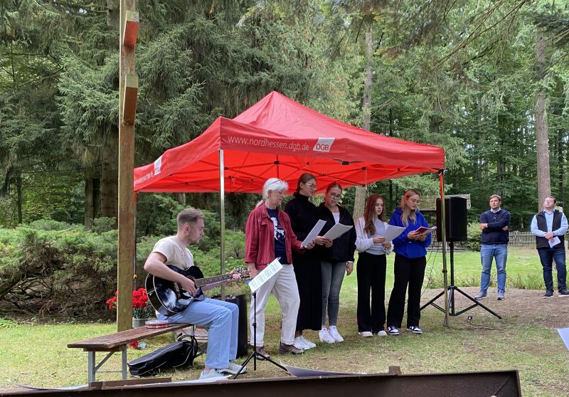 Beide Zeitzeugen sprachen auch nachmittags bei der offiziellen Gedenkfeier, die von der Gedenkstätte Trutzhain und dem DGB auf dem Waldfriedhof in Trutzhain stattfand. Frau Dr. Sievers, Q1-Schülerinnen und sogar ein ehemaliger Schüler des Schwalmgymnasiums gestalteten die Veranstaltung musikalisch, mit „Blowing in the Wind“, „Und der Regen rinnt“ und „Die Moorsoldaten“. Zum Abschluss wurden rote Nelken zu „Sag mir, wo die Blumen sind“ niedergelegt.