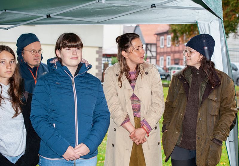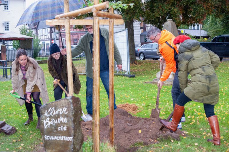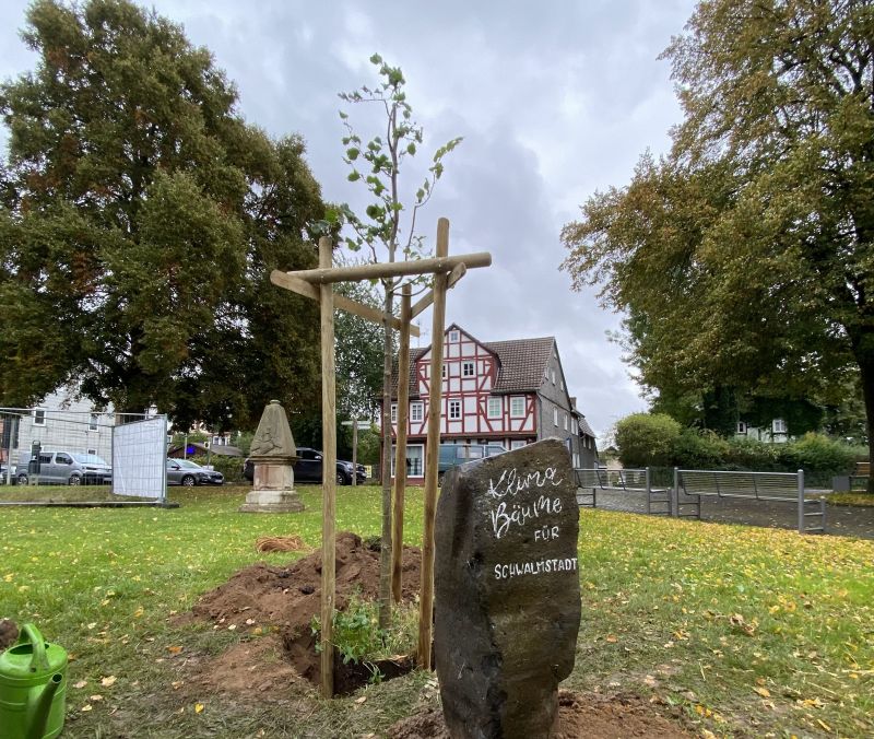 Wenn an einem Wochenende in den Ferien bei strömendem Regen Mitglieder der Umwelt-AG aktiv sind, dann hat das einen guten Grund: Unter dem Motto „Klima-Bäume für Schwalmstadt“ wurde am 4. Oktober die erste Pflanzung in Kooperation zwischen der Stadt Schwalmstadt, dem Förderverein Kulturlandschaft Schwalm e.V. und der Umwelt-AG des Schwalmgymnasiums auf dem Ziegenhainer Bauernmarkt initiiert. In Begleitung einer Basaltstele pflanzten wir eine Linde am Paradeplatz, welche der Schwälmer Brotladen freundlicherweise sponserte.