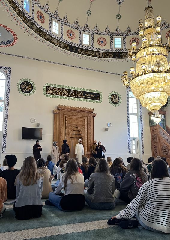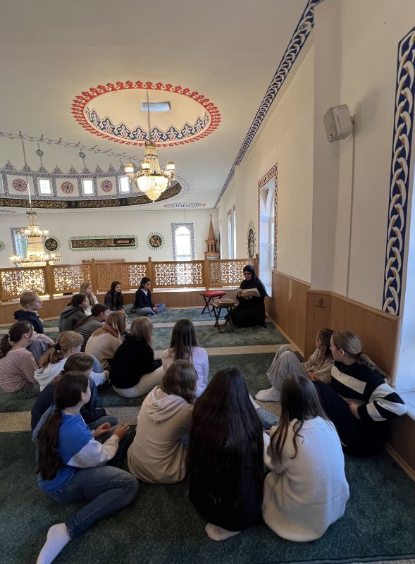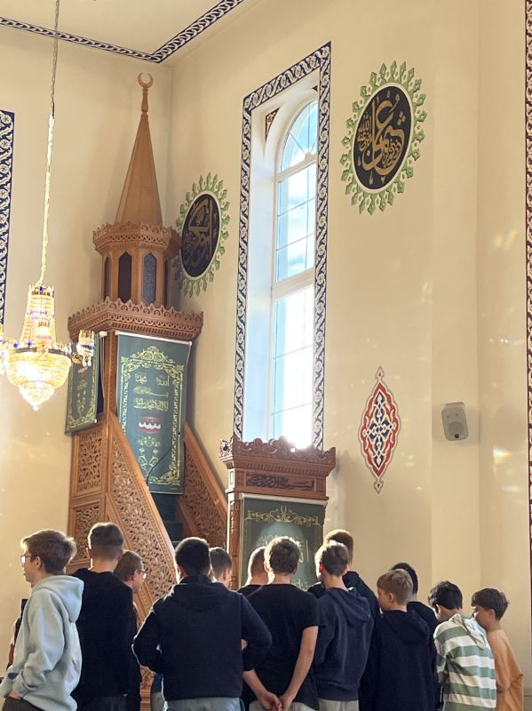 Wenn Verständnis und Toleranz entstehen sollen, braucht es Begegnungen und Austausch auf Augenhöhe. In dieser Überzeugung machen wir uns in den Fächern Religion und Ethik regelmäßig auf den Weg, um Menschen zu treffen, die uns von ihrem Glauben erzählen, und Orte zu besuchen, die ihnen heilig sind. So gehört auch ein Besuch in einer Moschee in Jahrgangsstufe 7 zum festen Programm. Natürlich in Socken! Denn wenn die Gläubigen aus Ehrfurcht vor Gott, arabisch Allah, beim Betreten ihres Gebetshauses die Schuhe ausziehen, achten auch wir als Gäste diese Regeln - und haben damit schon auf den ersten Metern viel über den Islam gelernt.