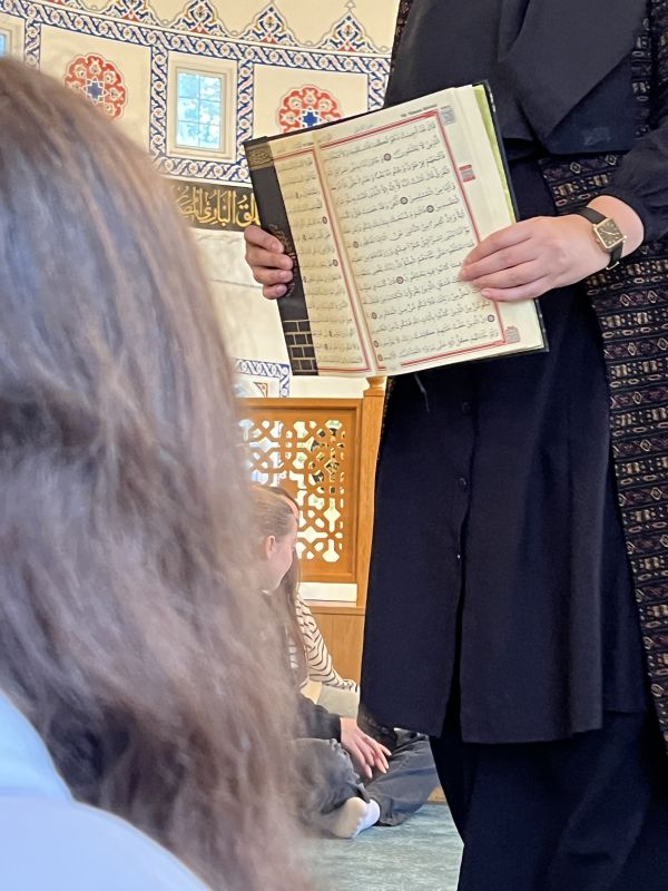 Ferdinand ergänzt: „Wir wurden herzlich begrüßt. Anschließend sind wir in festen Gruppen durch die Moschee gegangen.“ Unsere knapp 200 Schuhe fanden währenddessen Platz im Regal am Eingang. „Wir staunten, als wir drin waren“, beschreibt Paula ihren ersten Eindruck im Gebetsraum, „denn da waren lauter schöne Schriftzüge.“ Andere aus dem Religionskurs der beiden erinnern sich an den sauberen flauschigen Teppichboden, der angenehm zum Sitzen war, an die hohen Fenster, den beachtlichen Kronleuchter und insgesamt an die einladende Atmosphäre.