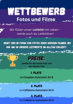 - Macht ein Foto oder einen Film (von max. 20 Sek. Dauer) passend zum Motto des Wettbewerbs, gerne mit Dir/Euch oder anderen Personen im Bild, die unserem Leitbild Leben verleihen! Es muss erkennbar sein, dass das Foto bzw. der Film am Schwalmgymnasium aufgenommen worden ist.