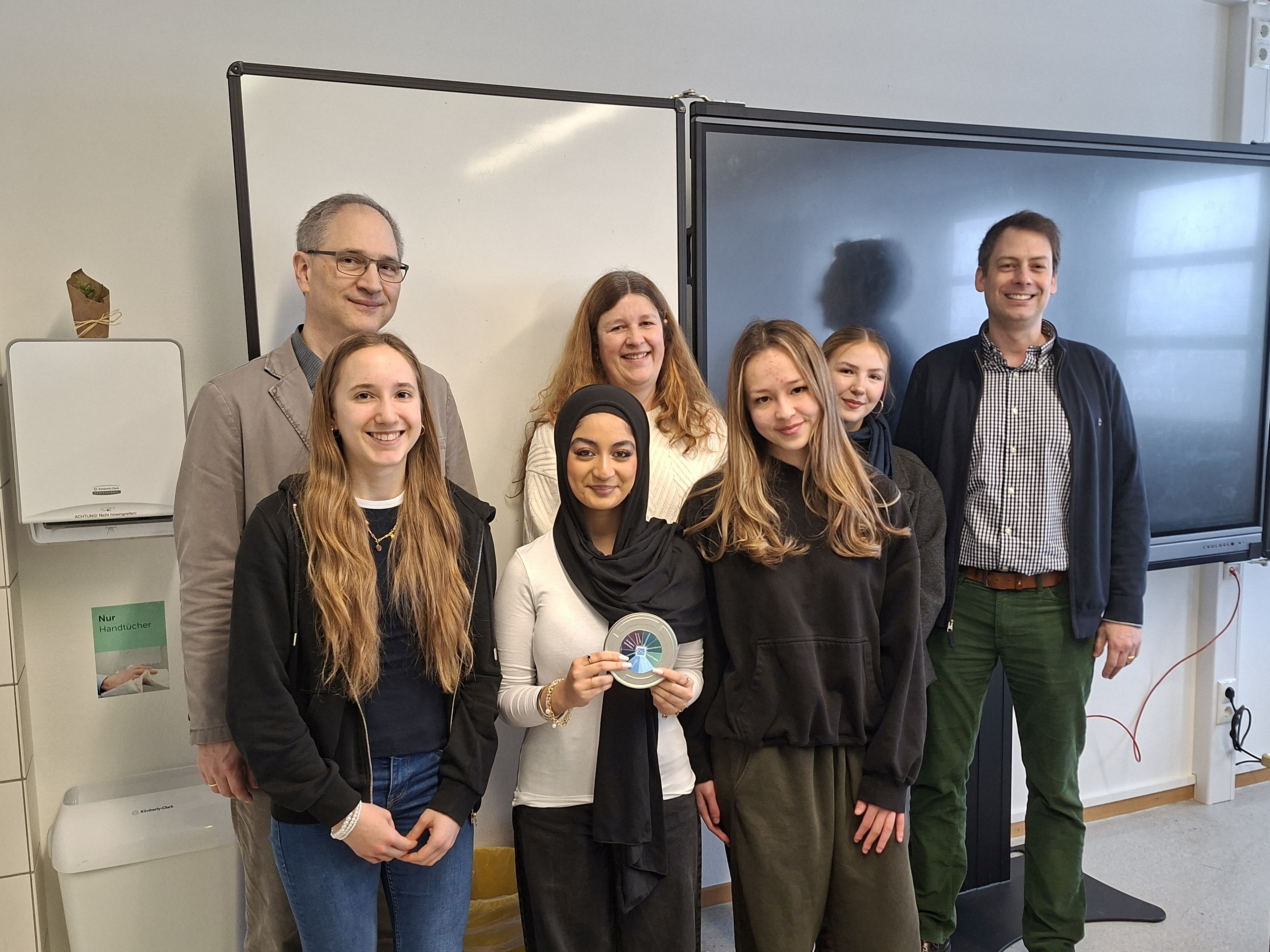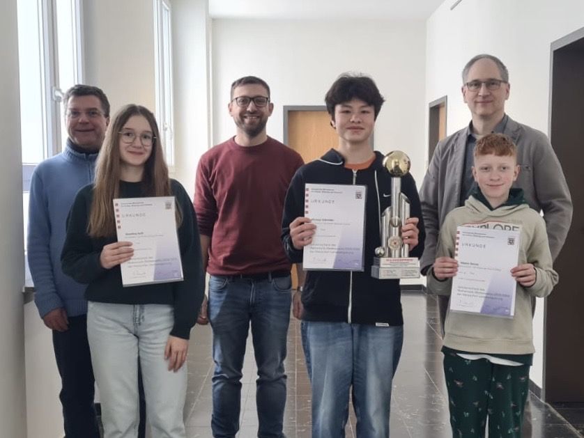 Über ihren Erfolg beim Mathematik-Wettbewerb des Landes Hessen freuen sich Dorothea Reiß, Maxim Slonov und Michael Schneider. Ihre beiden Mathematiklehrer Andreas Göbel und Michael Soub sowie Schulleiter Mario Cimiotti haben Dorothea und Maxim bei der Siegerehrung die Urkunden als zweite Schulsieger sowie Michael Schneider die Urkunde als ersten Schulsieger überreicht. Michael wurde zudem der Wanderpokal verliehen, der im Jahr 2008 vom ehemaligen stellvertretenden Schulleiter Holger Meyer gestiftet wurde und seitdem jährlich an die neue erste Schulsiegerin oder den neuen ersten Schulsieger weitergegeben wird. Alle drei Schulsieger haben mit Punktzahlen von 41.5, 41.5 und 44.0 Punkten hervorragende Ergebnisse erzielt und sich für die Teilnahme an der zweiten Wettbewerbsrunde (Kreisentscheid) am 4. März qualifiziert, auf die sie sich nun vorbereiten werden.